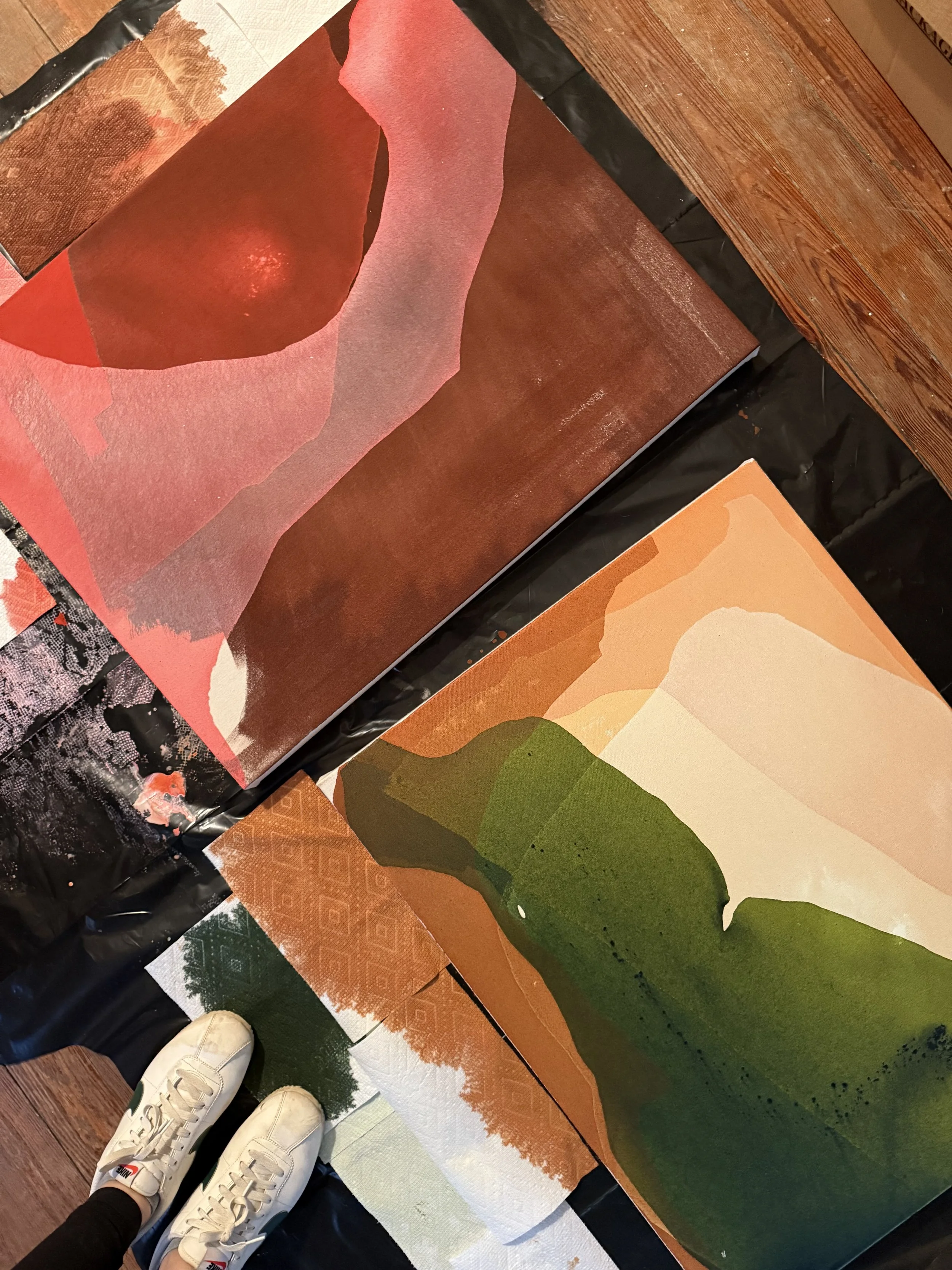 If you are requesting a Custom Commission, Erica will work with you to establish a Color Palette that fits your unique space. Prior to starting the painting she will send the color Palette for Approval, and send updated photos as the process moves along.